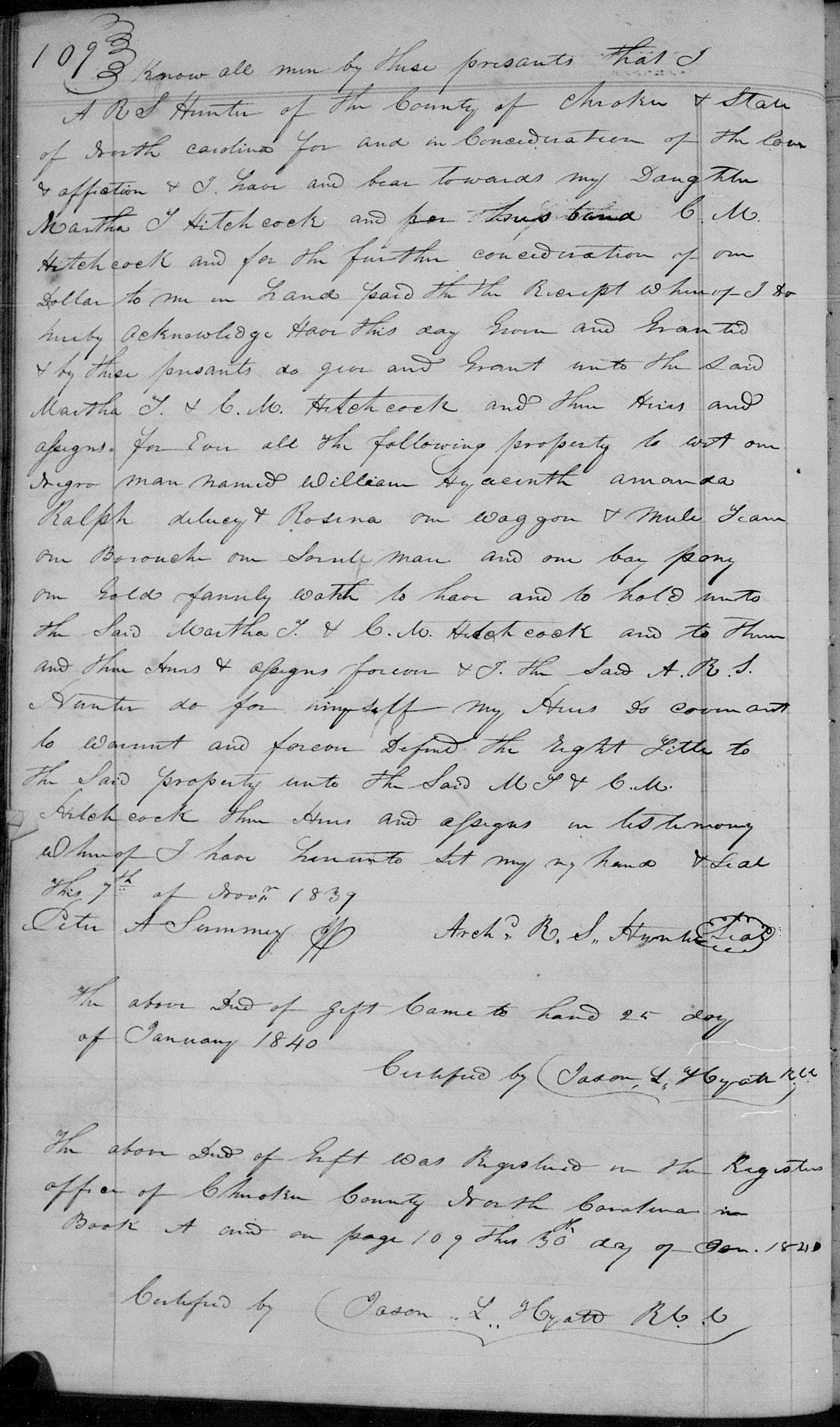 A.R.S. Hunter gave his daughter Martha J. Hitchcock and her husband C. M Hitchcock several Negroes and other listed property